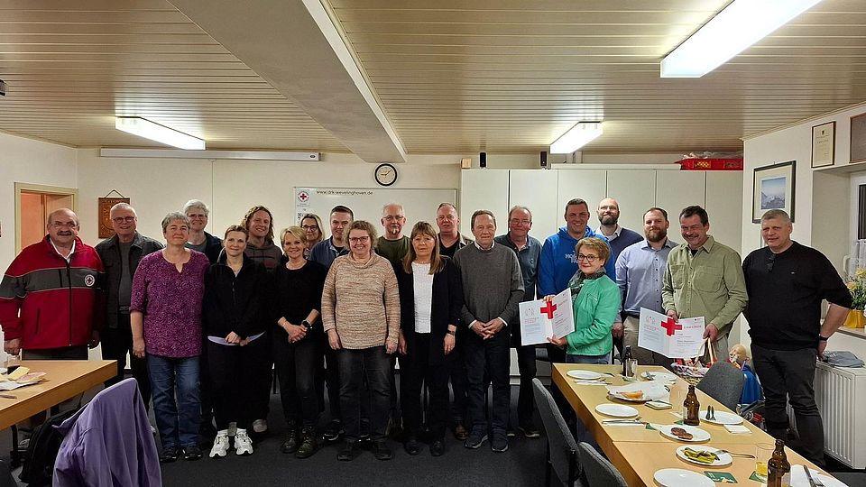 Am 25.02.2026 lud der Ortsverein Wevelinghoven des Deutschen Roten Kreuzes 28 Blutspender ein, die im vergangenen Jahr eine Jubiläums-Blutspende verzeichnen konnten. Diese runde Spende wurde bei einem der 17 Termine in Wevelinghoven, Kapellen, Bedburdyck, bei Polo in Jüchen oder in der Gesamtschule Hochneukirch abgegeben, einem der Spendeorte, die vom Ortsverein Wevelinghoven ehrenamtlich betreut werden. Unter den Eingeladenen waren 14 Spender mit 25 Blutspenden, 8 Spender mit je 50 Blutspenden, ein Spender mit 75 Blutspenden, 3 Spender mit je 100 Blutspenden und 2 Spender mit je 125 Blutspenden. Von den 28 eingeladenen Spendern konnten 21 Spender persönlich vor Ort begrüßt werden. Sie wurden von der Vorsitzenden des Ortsvereins Margarete Kranz, Bereitschaftsleiter Heinz Werres, seiner Frau Ute Werres, der „guten Seele der Blutspende“ sowie den stellvertretenden Bereitschaftsleitern Michael Tollhausen und Jürgen Pötzsch herzlich begrüßt. In einer kurzen Begrüßungsrede der Vorsitzenden, bedankte sie sich noch einmal herzlich bei den Spendern für das nicht selbstverständliche Engagement bei den Spendern und wies noch einmal darauf hin, dass die Anwesenden mit über 1.300 Spenden, und den dabei etwa 650 Litern gespendetem Blut ca. 3900 Menschen das Leben gerettet, deren Leid gelindert oder ihre Heilung ermöglicht haben. Sie nannte den Akt der Blutspende „gelebte Nächstenliebe“ auch weil die regelmäßigen Spender „da handeln, wo viele nur reden“.